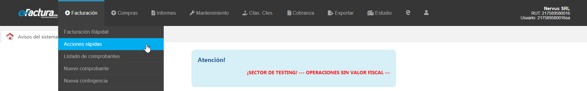 A esta seccion ingresas a traves del MENU principal opción: FACTURACION > ACCIONES RAPIDAS.