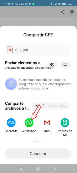 A continuación, se abrirá la aplicación WhatsApp y solo deberá indicar el contacto a quien le compartirá el comprobante.
