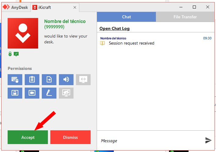 Cuando el técnico reciba su número de puesto de trabajo y solicite conexión, usted visualizará un mensaje similar al siguiente en su pantalla: