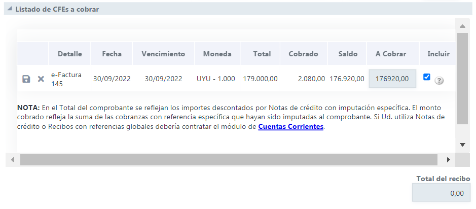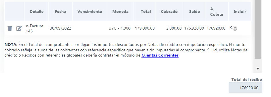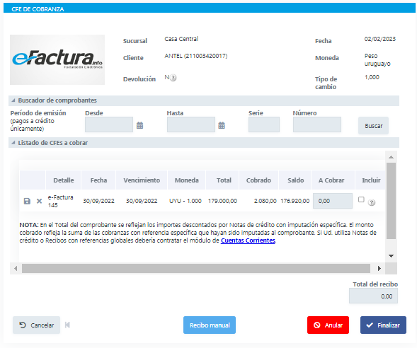 Este proceso genera un CFE de Cobranza el cual — al igual que los otros comprobantes — se finaliza cuando se hace clic en ícono
