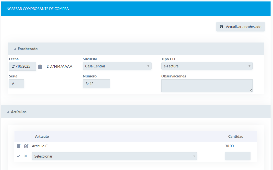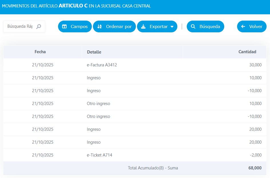 - Movimiento interno: marco de qué sucursal muevo la mercadería (campo Sucursal) y hacia cuál la llevo (campo Destino)