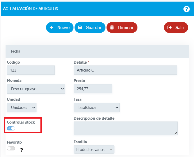 Para usar el módulo de Stock del sistema, el primer paso será crear artículos desde Mantenimiento/Artículos/Artículos, con la opción de "Control Stock" habilitada: