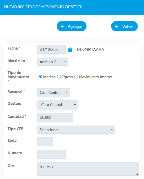 1- Movimiento manual o transferencia: para marcar egresos o ingresos de mercadería. Sin necesidad de marcar una compra, puede venir de otra sucursal o de afuera. Los únicos campos obligatorios tienen un asterisco (*)