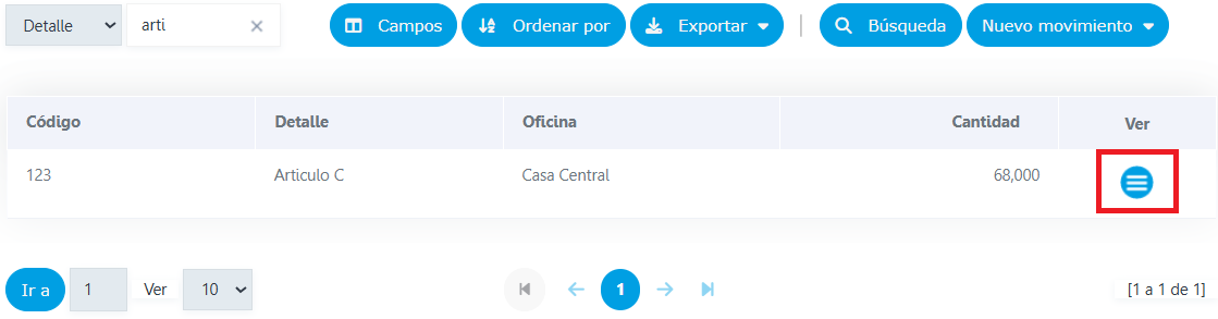 Habiendo ya ingresado el stock inicial, notaremos que a medida que vayamos facturando el artículo con control de stock, desde Mantenimiento/Artículos/Stock veremos los movimientos al ingresar al ícono resaltado en rojo: